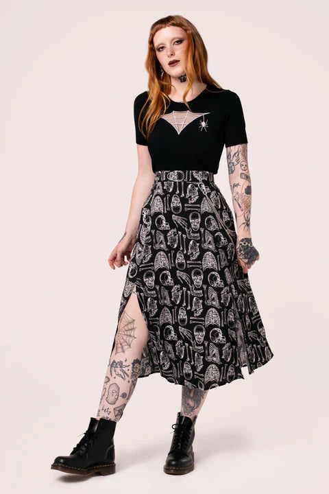 Falda negra intrincadamente ilustrada con arte de hueso blanco grabado.