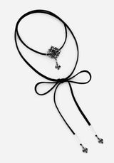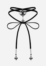 Largo cordón de antelina, rematado con cruces heráldicas plateadas, se enrolla alrededor del cuello formando un cómodo y elaborado lazo. Cabezas de gárgola con alas de murciélago rodean una piedra negra con efecto agrietado. Un accesorio ideal para cualquier criatura de la noche.
