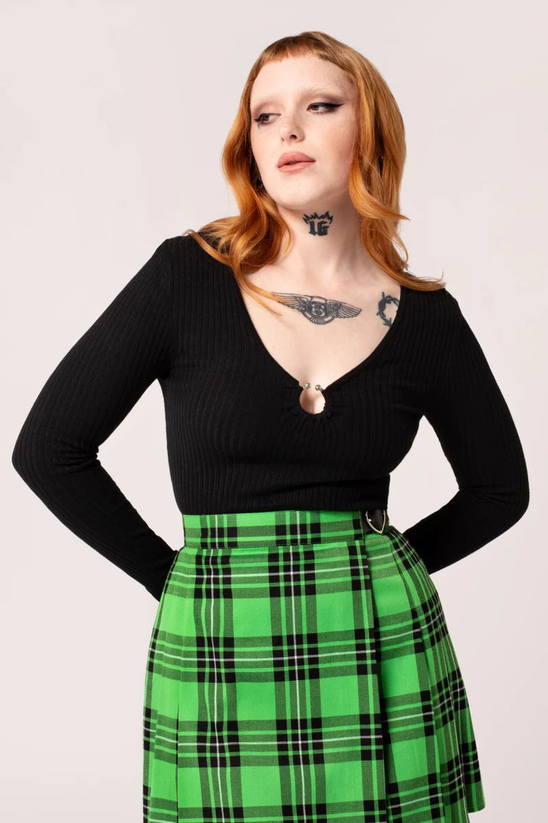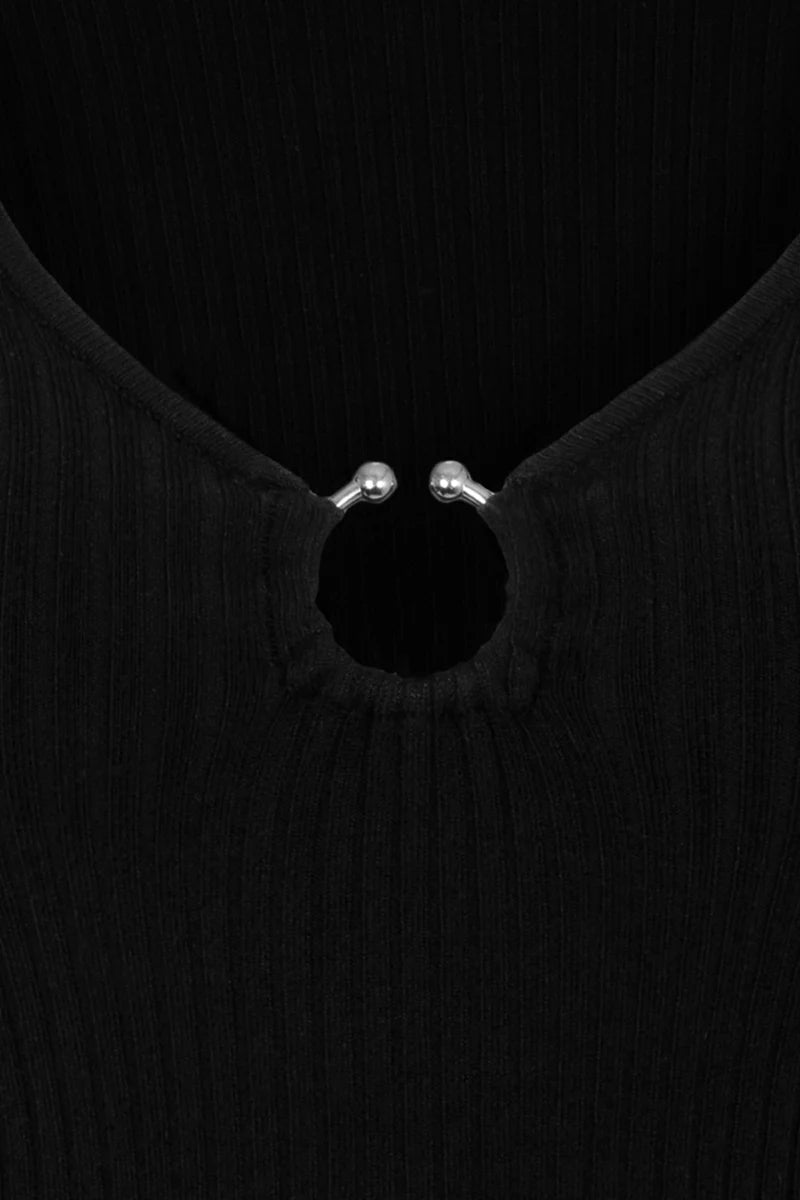 Escote en V en el pecho con detalles de metal plateado en el centro.