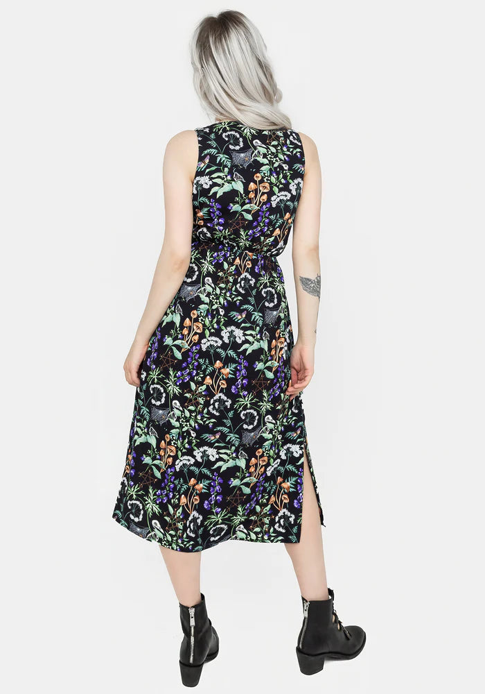 Estampado con flores de brujas, criaturas esqueléticas y delicados insectos entrelazados con pentagramas de madera sobre una base negra.